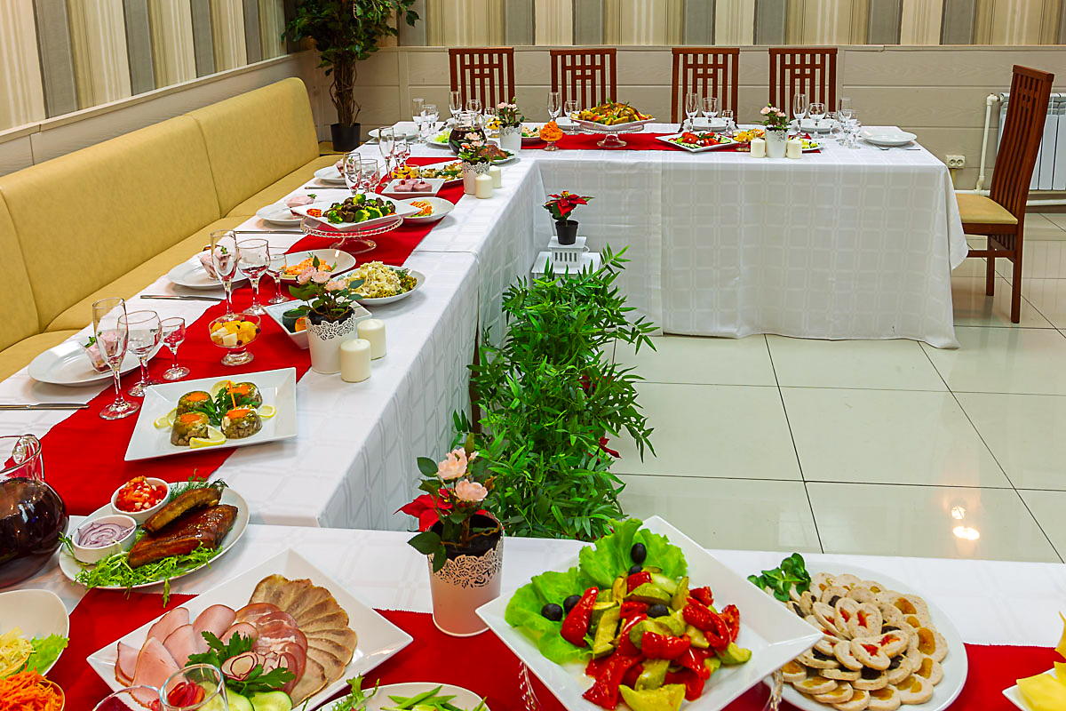 Для официальных и торжественных мероприятий предлагаем организовать банкет с размещением за накрытыми столами. В столовых Трапеза банкеты проводятся в будни после 16:00 и до полуночи, в выходные - в любое время.