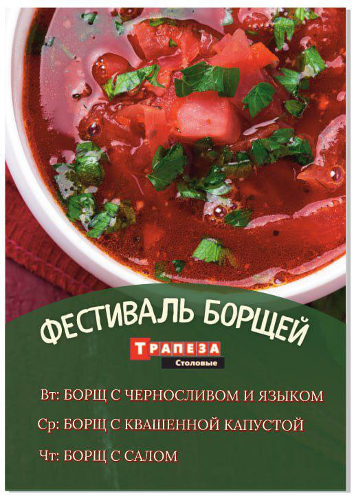 во всех столовых сети “Трапеза” мы предлагаем борщ по уникальным рецептам.
