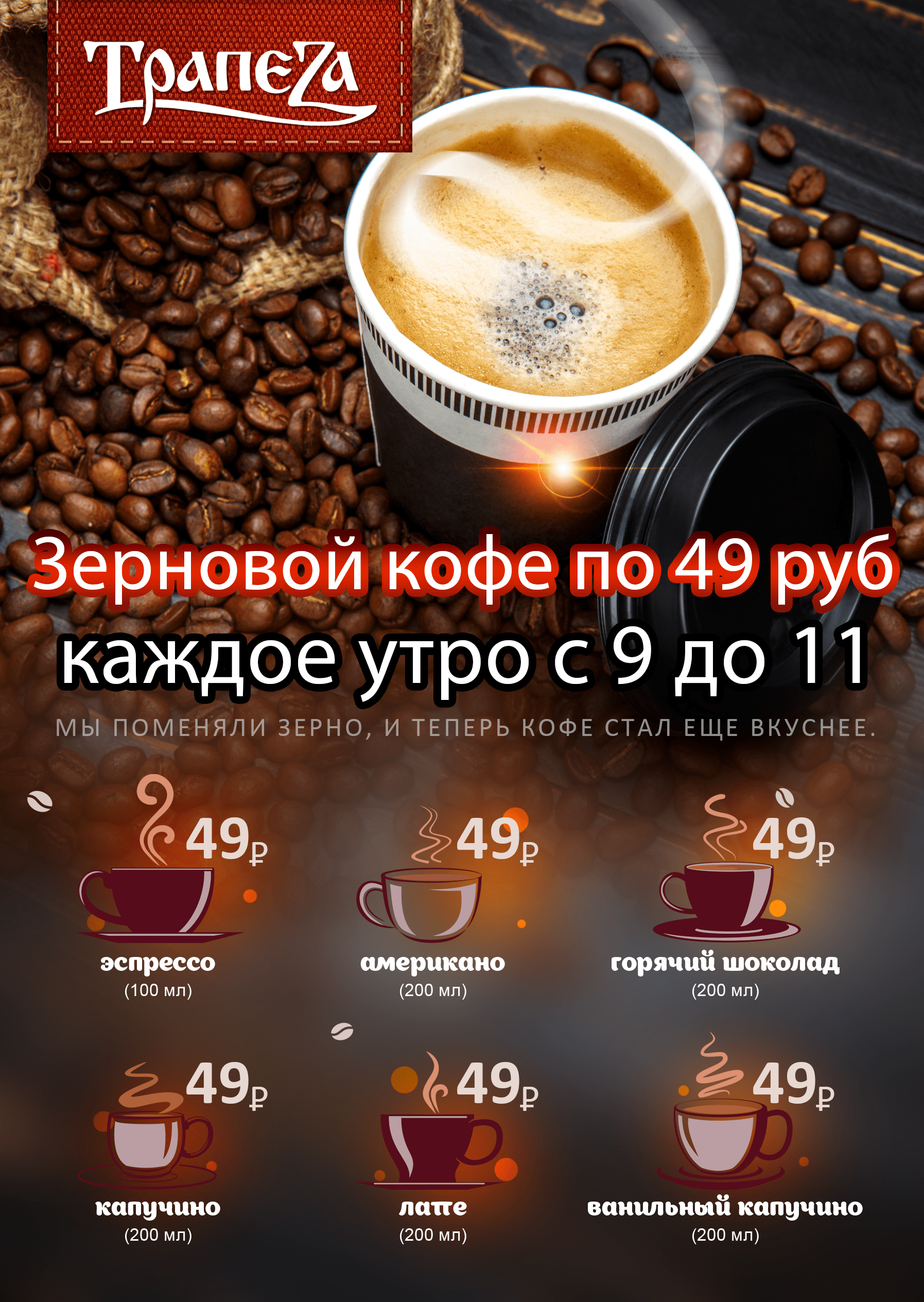 С 8:30 до 11:00 во всех столовых сети “ТрапеZа” любой зерновой кофе по 49 рублей.