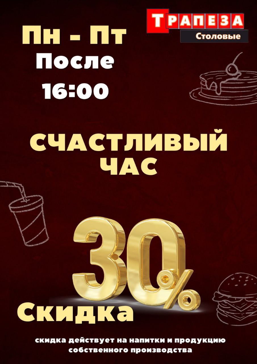 Теперь с 16 часов у нас начинаются скидки на все блюда и десерты. Скидка каждый день с 16 часов – 30%. Сытный ужин в предверии выходных , как отличное завершение тяжелого дня, когда на готовку дома уже не осталось сил. Ужинайте в Трапеза!